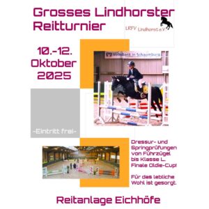 Unser großes Turnier steht kurz bevor, es sind über 500 Nennungen bereits eingegangen! Wer uns aus dem Verein noch Freitag, Samstag oder Sonntag unterstützen möchte, sei es mit einem Kuchen, im Stübchen oben in der Küche, zum Schreiben beim Richter, auf den Plätzen oder in der Halle – alle helfenden Hände sind willkommen. Bitte meldet Euch beim Vorstand oder bei Whats App, wir freuen uns!