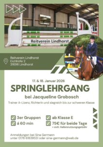 Wer möchte sich noch auf die kommende Saison vobereiten mit unserer A-Lizenz Trainerin Jacqueline Grobosch? Am 17. + 18. Januar findet ein Springlehrgang bei uns in der Halle statt, Anmeldungen bitte bei Sina Germann unter : 0176-61839551