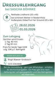 Es findet ein toller 2tägiger Dressurlehrgang mit Sascha Böhnke statt am 28. Februar und 1. März 2026. Anmeldung bei Birgit unter 0172-2053948