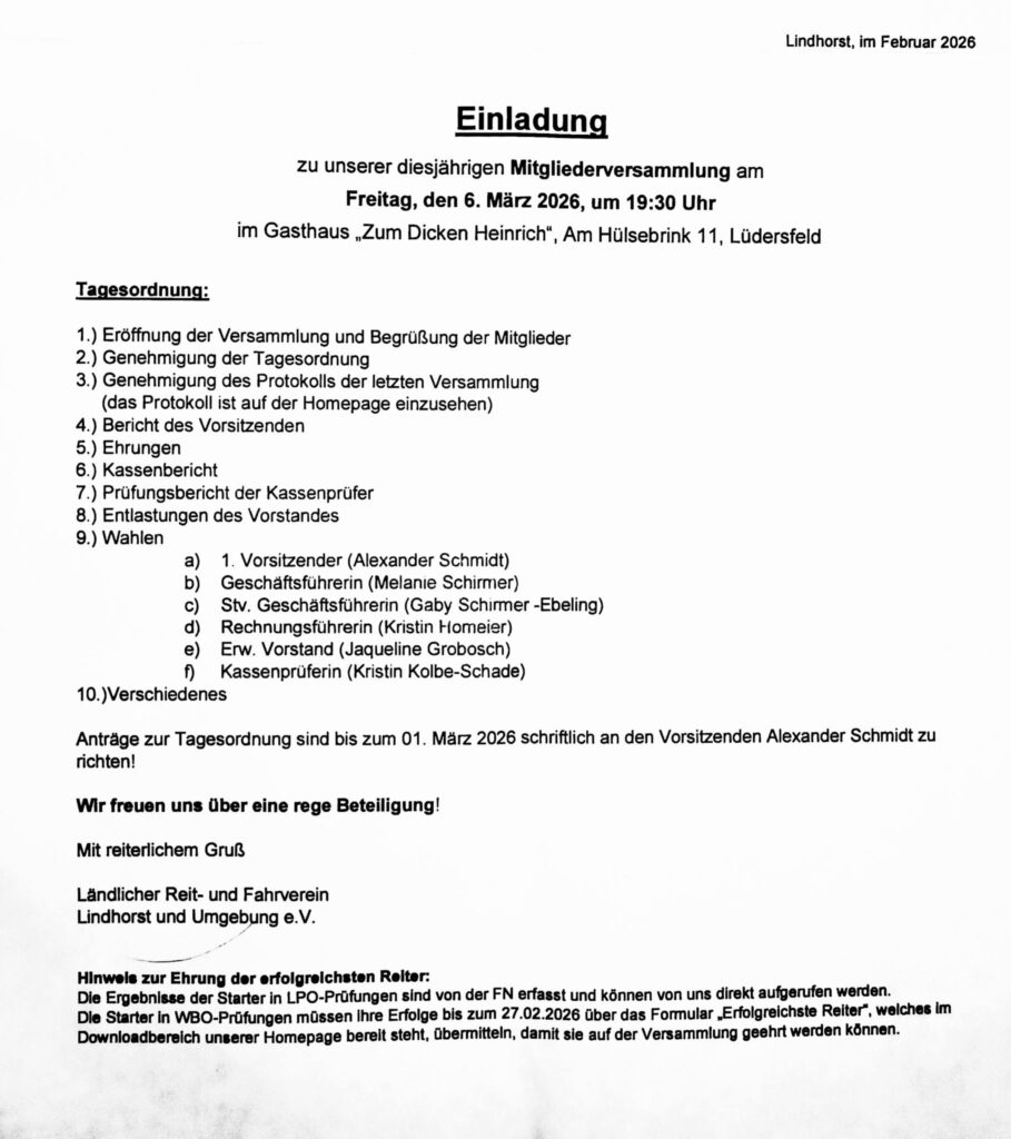 Wir laden all unsere Mitglieder herzlich zu unserer diesjährigen Mitgleiderversammlung ein! Die Versammlung findet wie immer im Gasthaus „Zum Dicken Heinrich“ in Lüdersfeld, Am Hülsebrink 11, statt. Am 6. März 2026 ab 19.30 freuen wir uns auf Eure rege Beteiligung! Wer noch schnell Mitglied werden möchte, findet unseren Mitgliedsantrag unter Downloads